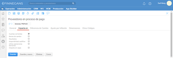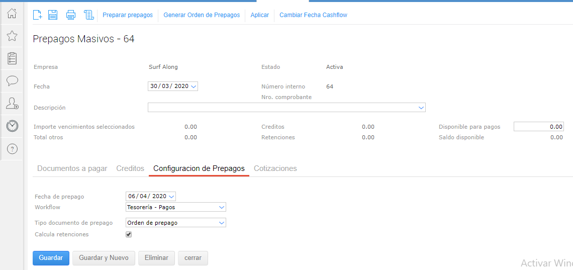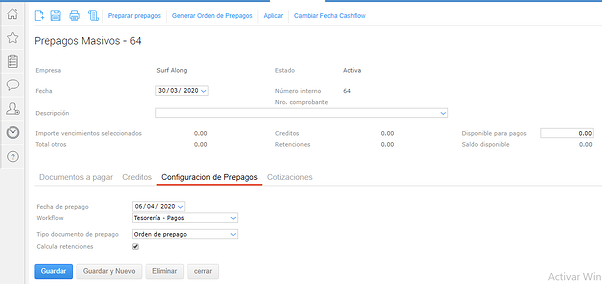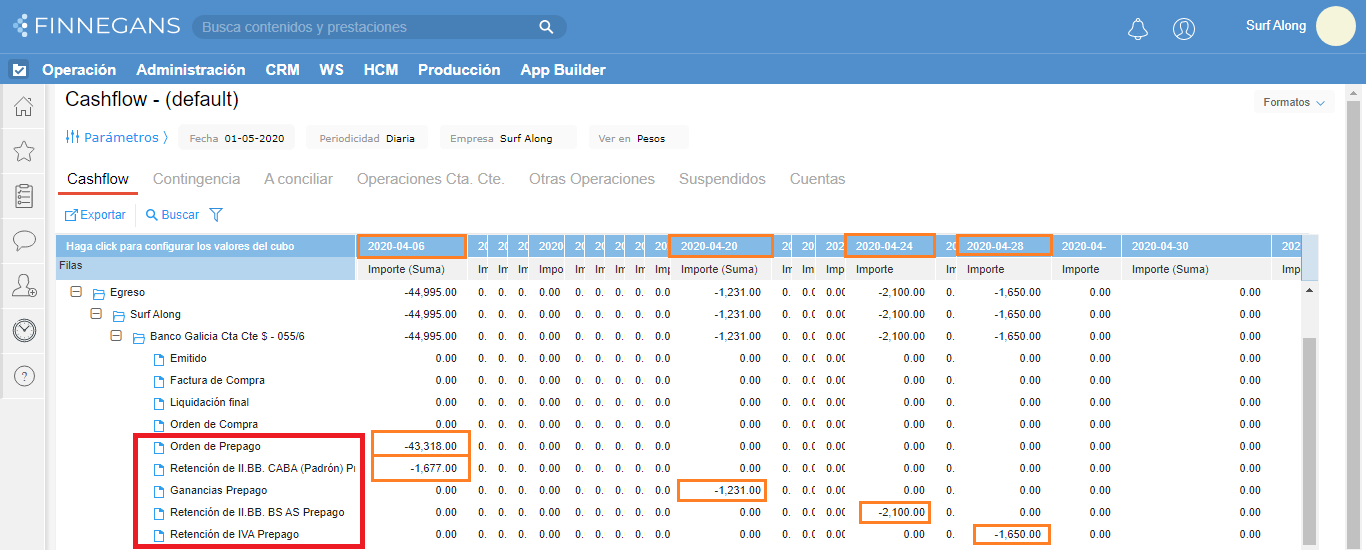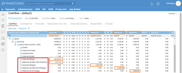 Las órdenes de prepago impactan en el cashflow diferenciando, de manera estimativa, el monto que tendremos que pagarle efectivamente a nuestro proveedor de aquel que le será retenido. Una vez efectuado el pago y cancelada la orden de prepago, esta ya no impacta más en el cashflow. Mientras que las retenciones pasarán a aparecer con el saldo real retenido, hasta la fecha de su pago a AFIP (la cual se configura desde el maestro de Tipos de retención)
