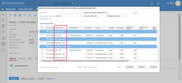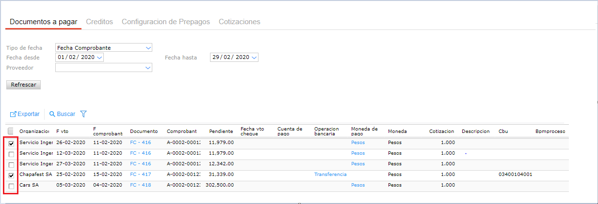 Desde los checks resaltados se pueden seleccionar independientemente cada uno de los documentos. Si un documento tiene más de un vencimiento, en esta vista se va a ver aperturado cada vencimiento del comprobante.