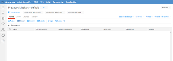 Se accede a esta funcionalidad a partir de Operación → Tesorería → Prepagos.
