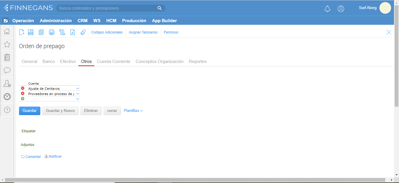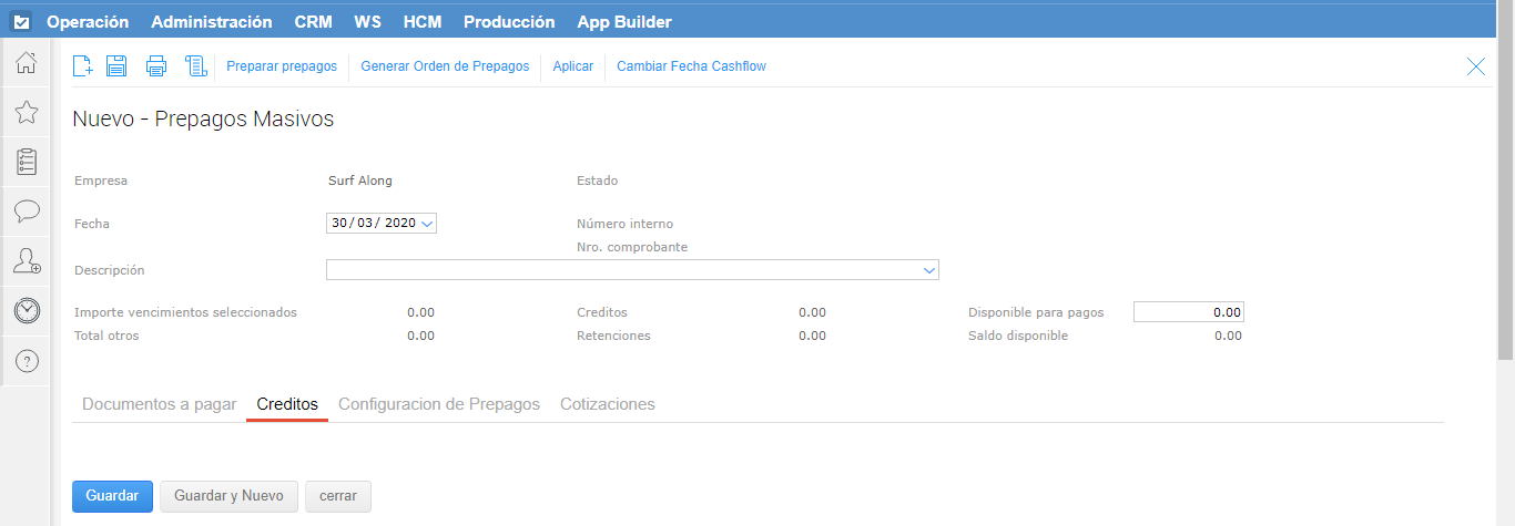 Desde el botón “nuevo”, generamos una nueva orden de prepago.