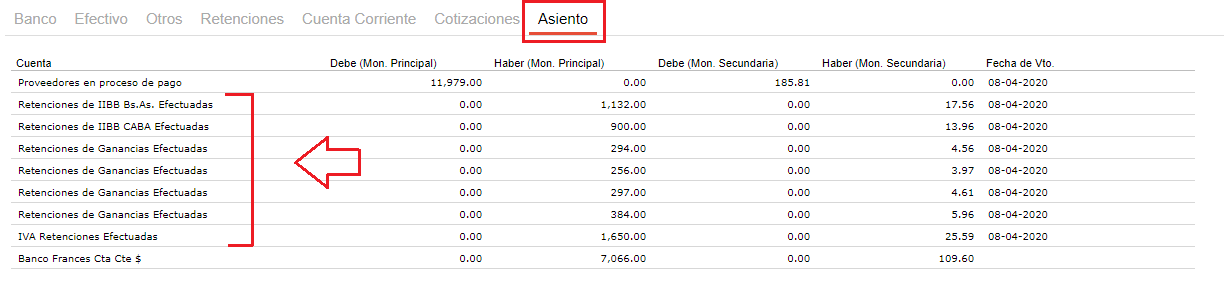 En el asiento podemos notar que se debita la cuenta puente “proveedores en proceso de pago” y finalmente se da el impacto contable de las retenciones