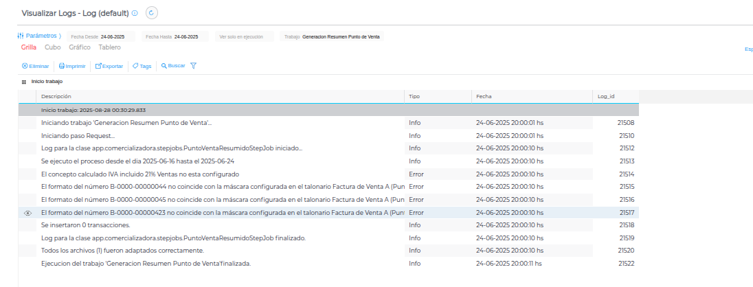 Se puede observar que las ventas Id 123457, 123460 y 123461, cuyo código de tipo de documento es PTOVTA-FVST, no se deberán procesar en este trabajo, ya que no esta definido en el parámetro “DOCUMENTOS_SELECCIONADOS”.