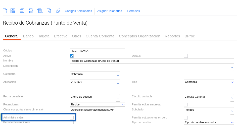 Nota: En la configuración del Tipo de documento Recibo de Cobranzas debe estar vacío el check de “Administra Caja”.