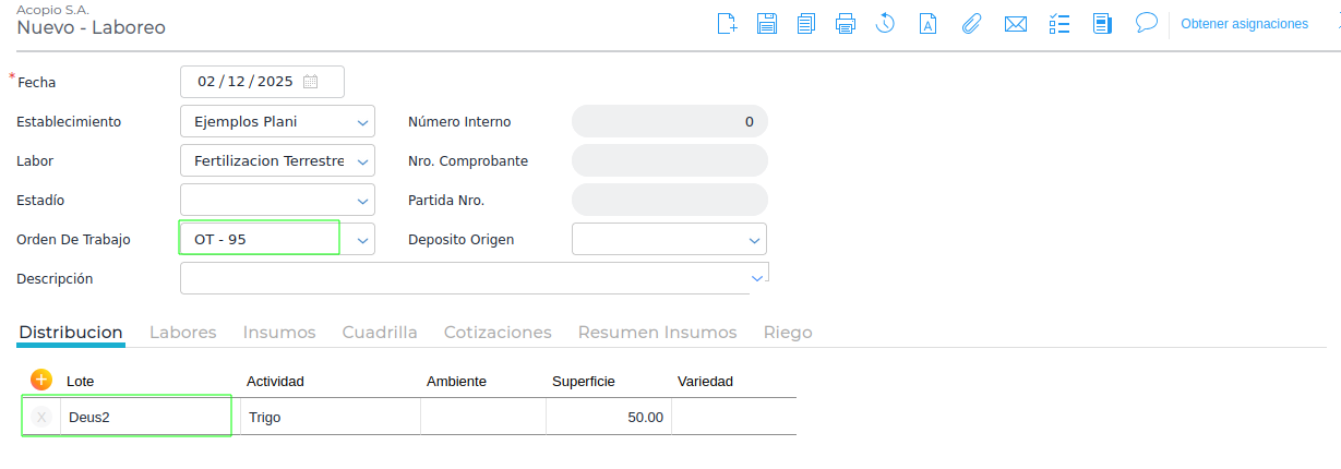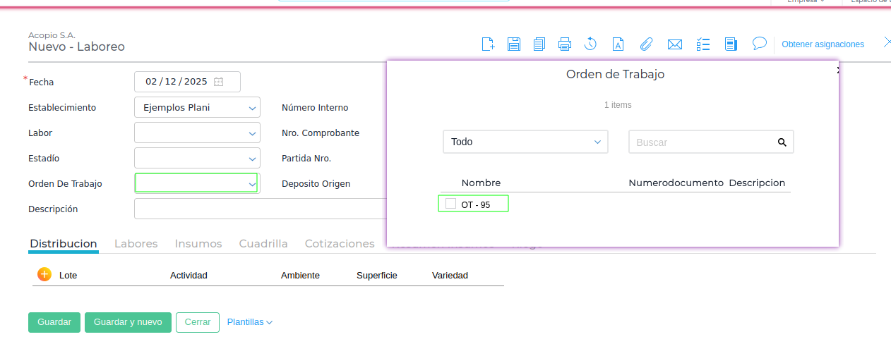 Cabe destacar que aunque trae solo un lote, importa todas las laboreos que se hayan cargado en la orden de trabajo inicial pero el sistema permite eliminarlas o editarlas si hiciese falta.