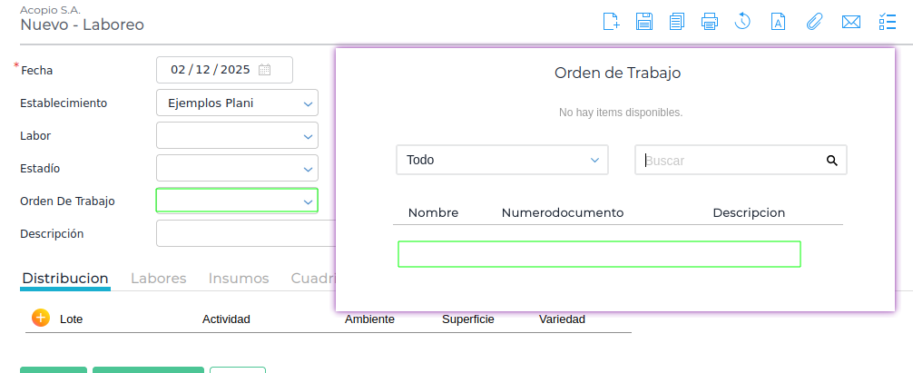 Un dato importante es que cuando se seleccione la orden de trabajo, solo va a traer la actividad en el lote que no se laboreó con esa orden de trabajo.