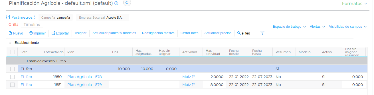 En la planificación agrícola puede suceder que se asigne un plan por una cantidad parcial de has cuando se necesitaba planificar la totalidad con un solo cultivo. En este caso mostraré un ejemplo con dos has asignadas de y 8 sin asignar.