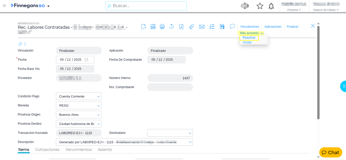 Para eliminar una recepción de labores contratadas que ha sido finalizada, primero debes reactivarla. Sigue estos pasos:
