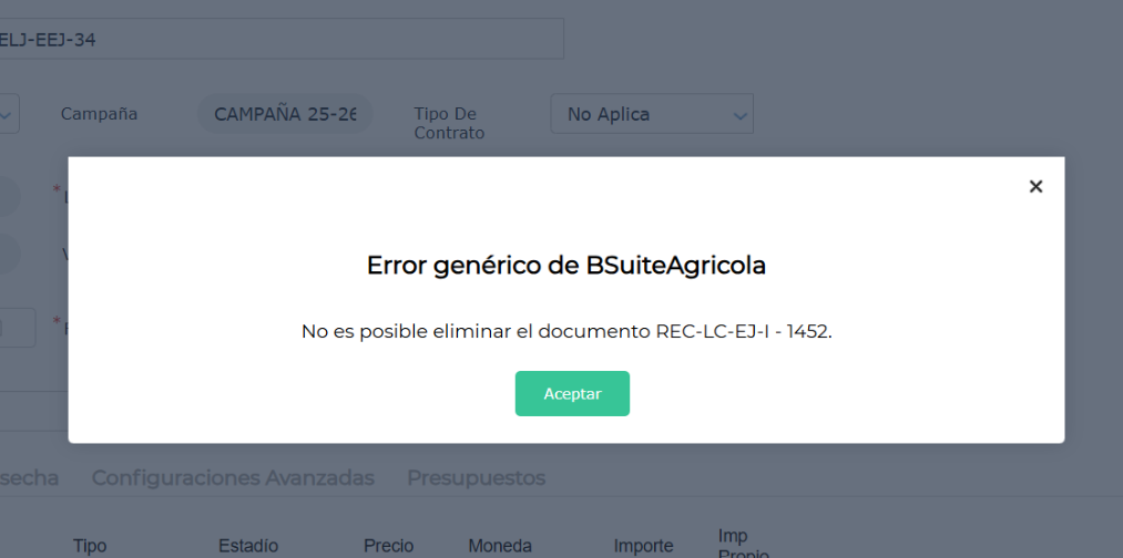 Al querer eliminar una recepción de labores contratadas, el sistema arroja el siguiente error :