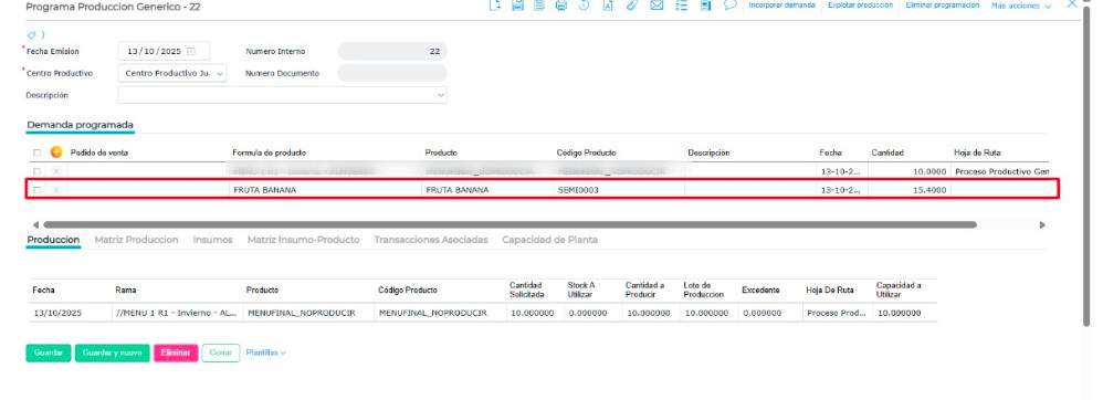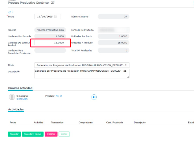 Es decir, la cantidad de batch definida en la fórmula de producción determinará la cantidad necesaria a producir para cumplir con la demanda.