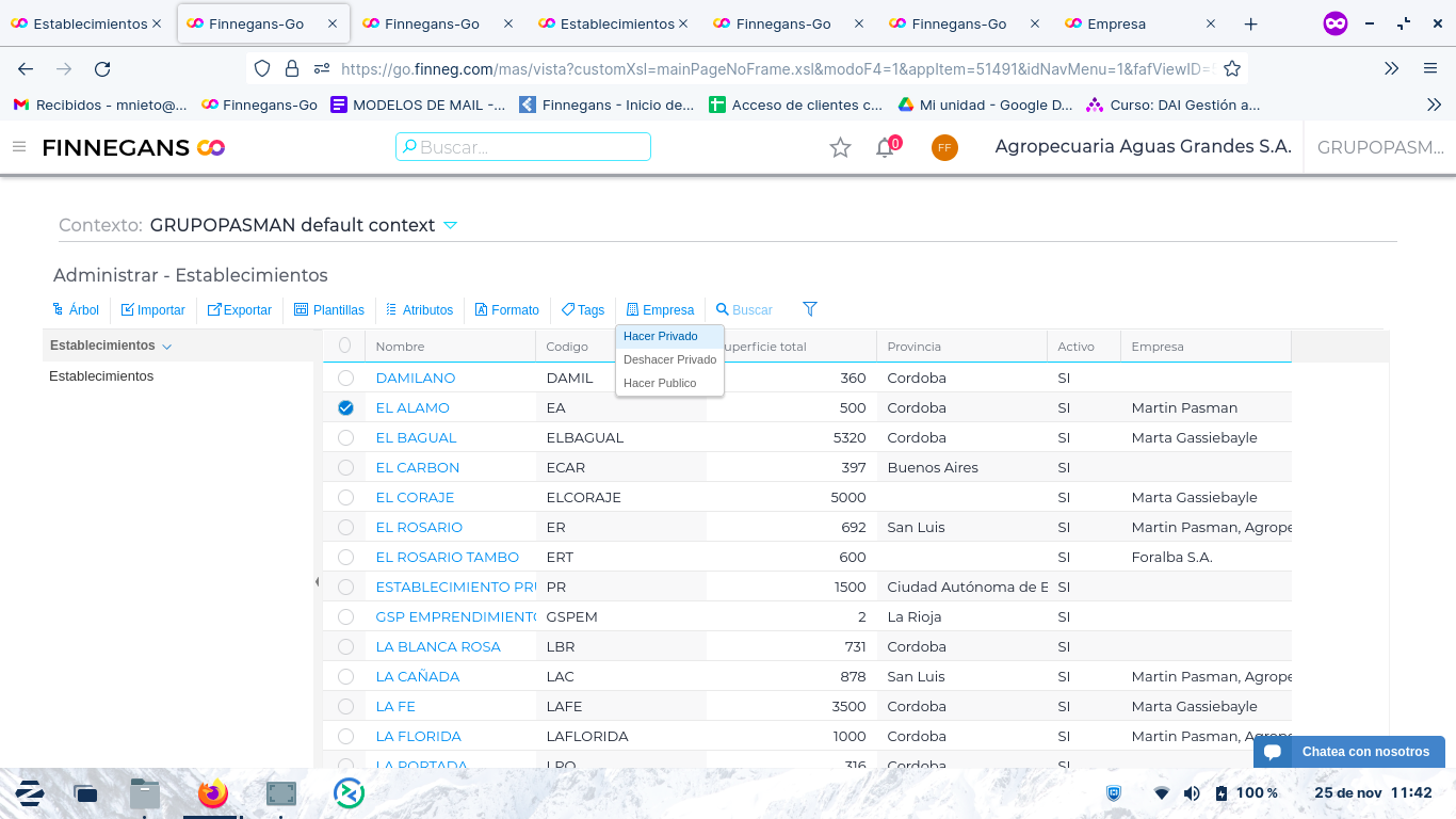 - Se selecciona la opción Hacer Privado y se completa automáticamente el campo Empresa en la grilla con la empresa en la que se está logueado. Si se repite el mismo procedimiento con otras empresas, el registro será privado para todas aquellas empresas con las que se haya realizado.