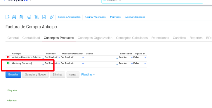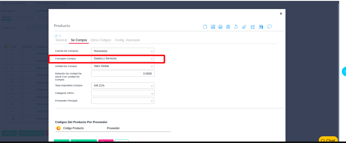 Asignar el concepto de compra correspondiente al producto del contrato (Gastos y Servicios en este caso).