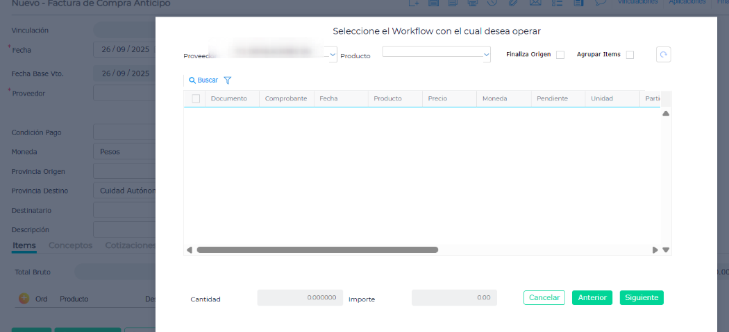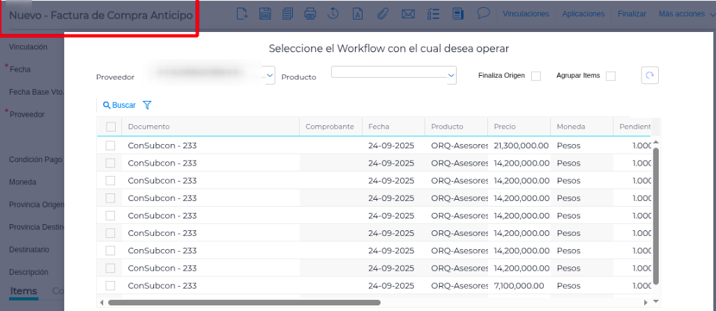 Cuando intentas cargar una “Factura de Compra Anticipo” utilizando el asistente con el tipo de documento “Contrato de Subcontratista” y “Factura de Compra Anticipo,” no se visualiza ninguna información.