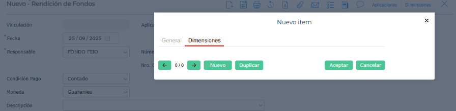 Al cargar una rendición de fondos y seleccionar el producto en cuestión, no se puede seleccionar una dimensión.