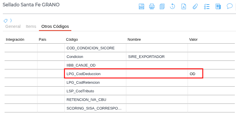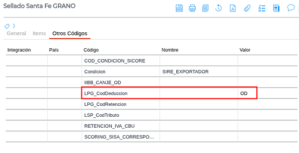 Dentro de la solapa Otros Códigos, ingresar al código LPG_CodDeduccion y agregar el valor OD.