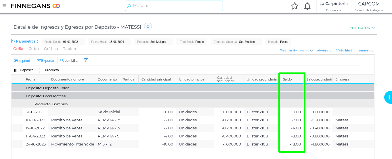- Detectar saldos de stock negativos. Por ejemplo en un informe de “Detalle de Ingresos y Egresos por Depósito”