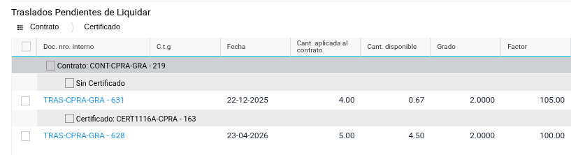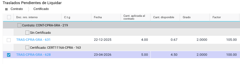 Al completar los parámetros del tablero, en la sección Traslados Pendientes de Liquidar van a figurar las recepciones asociadas al contrato que aún tengan kilos disponibles para liquidar: