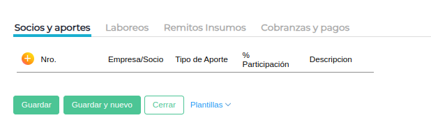 Laboreos: Aporte de trabajo y maquinaria. Se deben seleccionar los Laboreos Específicos que realizará el socio (ej. Aplicación, Cosecha).InsumosAporte de productos (semillas, agroquímicos).