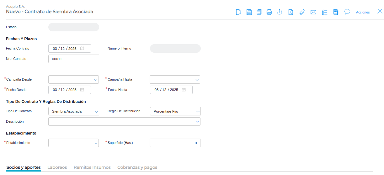 Alerta: Si no se realiza este paso, los labores y movimientos de insumos ejecutados posteriormente en el sistema nunca se vincularán automáticamente al contrato, y por ende, no serán considerados para el cálculo de la distribución de granos.
