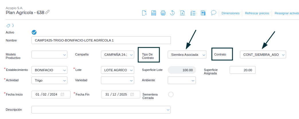 Este es un paso crucial, para que los movimientos reales (Laboreos, Consumo de Insumos) queden correctamente asociados y se puedan considerar en el informe de distribución de granos, el contrato debe estar vinculado a la Planificación Agrícola.