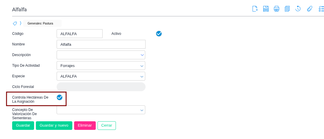Por otro lado, en el maestro de actividades (Menú>Configuración>Empresas>Agro>Actividades), en la actividad que necesiten, hay un check “Controla Hectáreas de la Asignación”: ese chek se utiliza para controlar que el sistema no permita cargar cosechas por más hectáreas de las planificadas. Esto asegura que las actividades agrícolas no superen las hectáreas asignadas en el plan, evitando errores y asegurando la correcta gestión de los recursos. Es decir que a través de ese check, pueden controlar cuando destilden el otro del establecimiento.