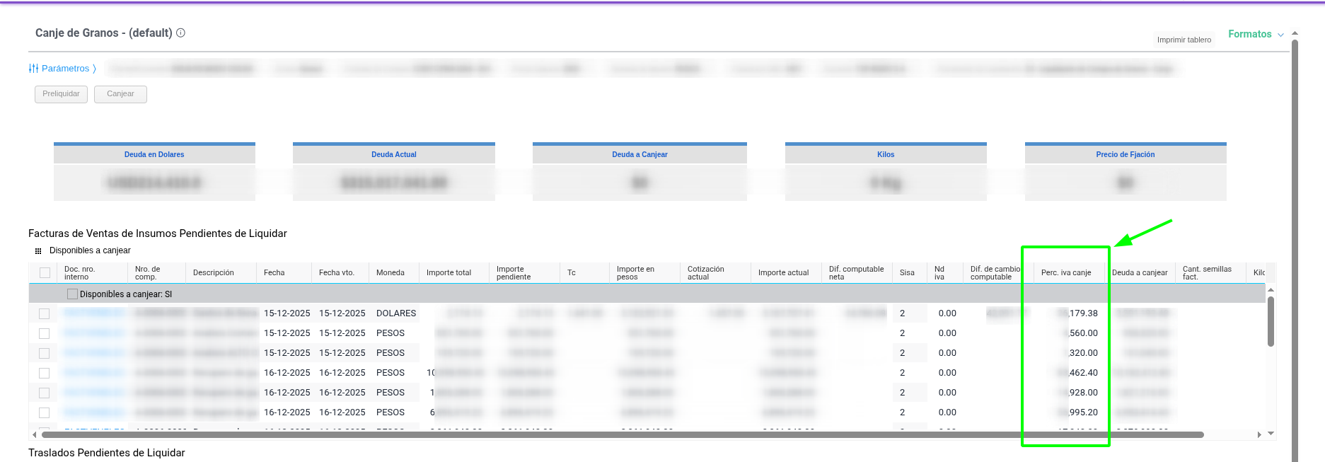 Al abrir el tablero de canje de granos para avanzar con el proceso, vemos que la columna de “Per. IVA Canje” no muestra nada: