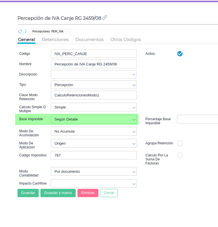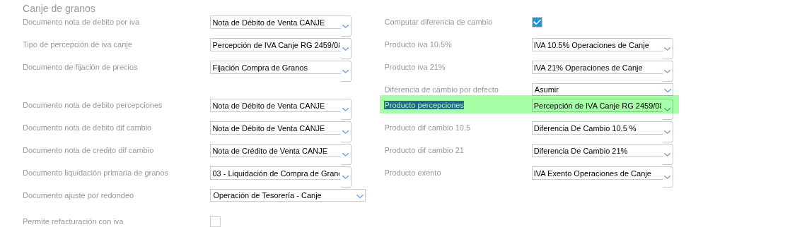 Una vez verificad la configuración del tipo de retención, debemos ingresar al tipo de documento “Canje” y revisar el “Producto percepciones” configurado.