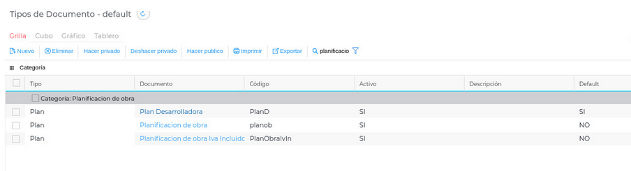 Al revisar en el maestro “Tipos de Documentos”, se puede verificar que el documento correspondiente a “Plan Desarrolladora” está configurado bajo la categoría “Planificación de Obra”.