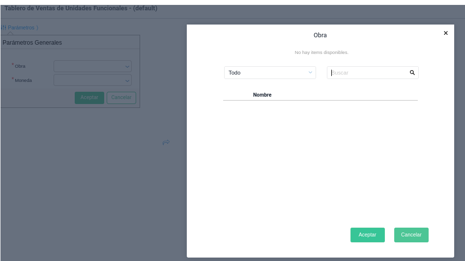 Al generar un plan desarrolladora en el cual ya se encuentran creados los centros de costos, unidades funcionales (UF), contratos de venta y demás elementos necesarios, al momento de utilizar el informe “Tablero de Ventas - Unidades Funcionales”, la obra correspondiente no aparece disponible en la configuración de parámetros del informe.