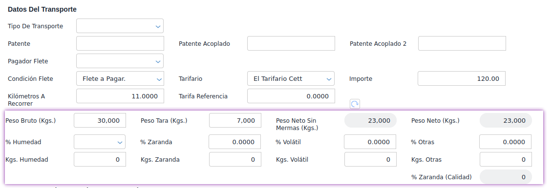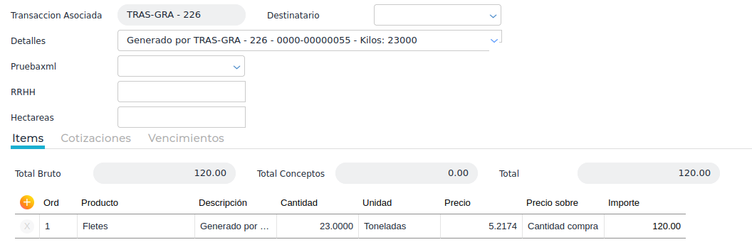 En el siguiente ejemplo, al ser 120 U$S el importe en rangos entre 10 y 20 kilometros y al traslado ser por 11 kilómetros, se calcula como precio fijo U$S 120 y al ser 23 toneladas, el precio por tonelada se calcula 120U$S/23TN resultando en 5.21 U$S por tonelada en al recepción de fletes.