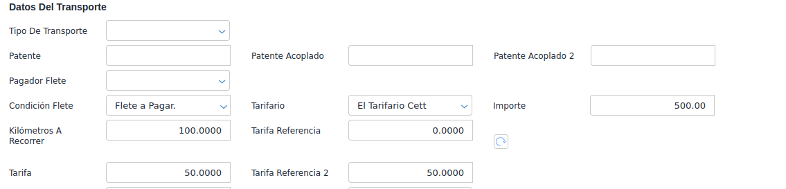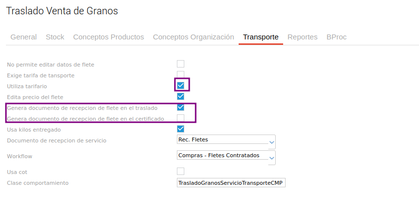 Un documento de traslado, en el tipo de documento, tiene una solapa que se llama transporte, en la cual uno puede verificar si se genera un documento de recepción de flete en el traslado o si se genera un documento de recepción de flete en el certificado. En estos casos, cuando se genera la recepción de flete, este traslado toma el tarifario del maestro de tarifarios para editar su valor.