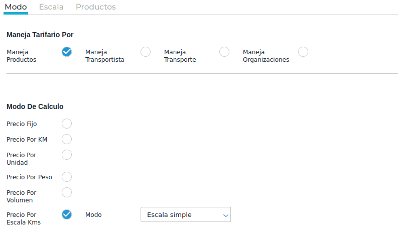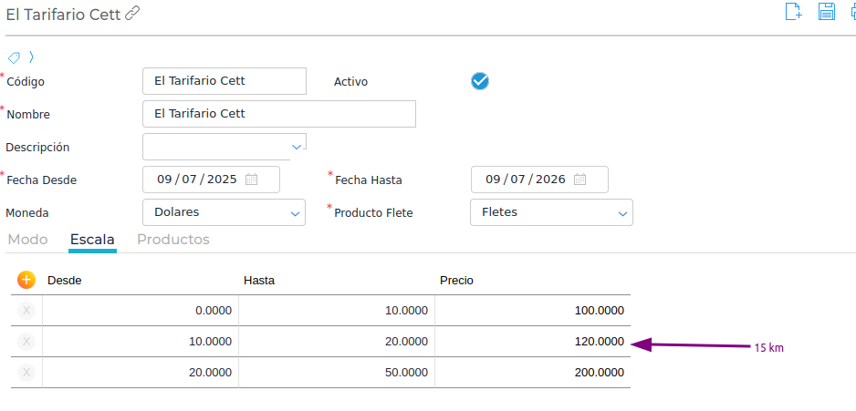 Al seleccionar el modo de calculo por escala, se habilita la solapa “escala”. En donde se colocan los precios que tiene el flete para diferentes escalas de kilometros.