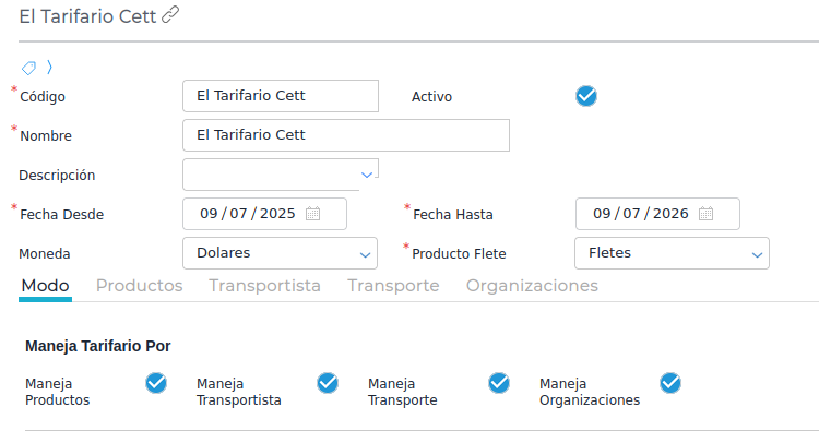 El tarifario puede manejar productos, transportista, transporte y organizaciones.