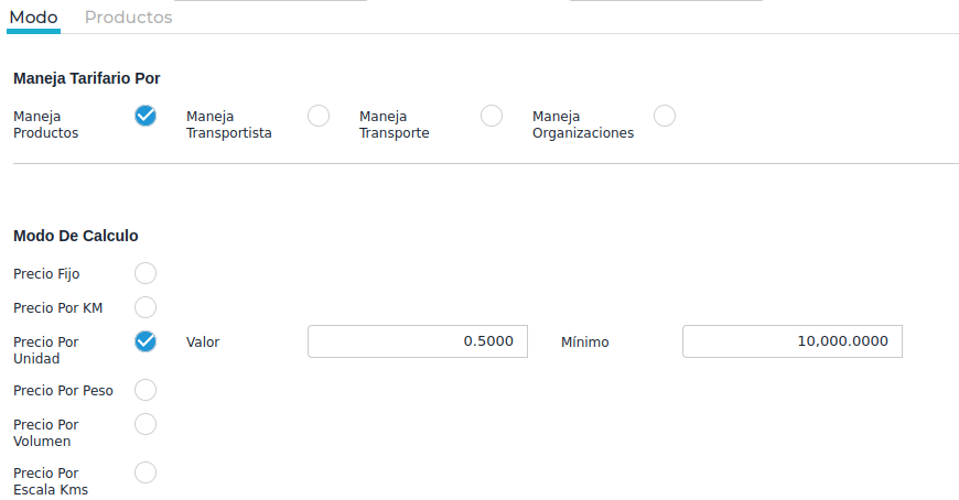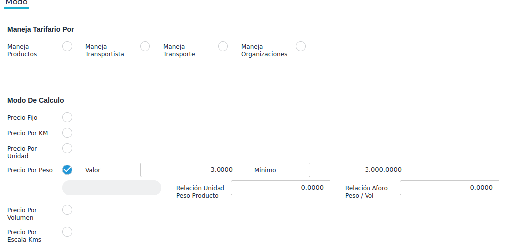 Entonces, por ejemplo, si se configura un mínimo de 10000 kgs y un valor de 0.5U$S por kg, si se trasladan 5000 kgs, el tarifario va a calcular como si fuesen 10000 kgs.