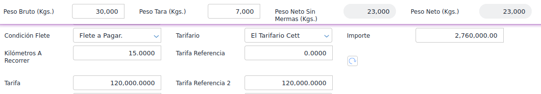 En este caso, el cálculo si se envían 15 km es el precio de la escala en la que se encuentra la cantidad de kilometros * la cantidad de toneladas trasladadas (Peso neto).