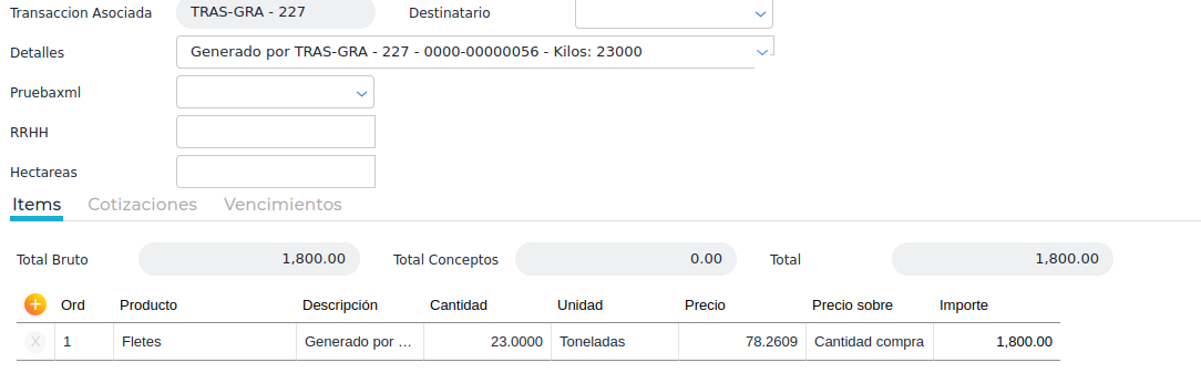 Por último, como el importe total del traslado es de 1800 U$S y el peso neto del traslado es de 23 toneladas, el precio por tonelada es de 78.26 U$S.