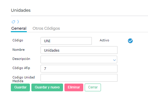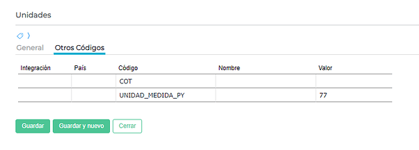 Se debe completar en el maestro de unidades , el campo Código de la solapa general y el campo UNIDAD_MEDIDA_PY en la solapa Otros Códigos según la siguiente tabla