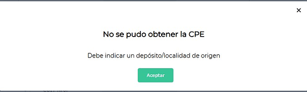 Problema: Al intentar obtener la CPE de un traslado de venta de granos, el sistema arroja el siguiente aviso: No se pudo obtener la CPE: debe indicar un depósito/localidad de origen