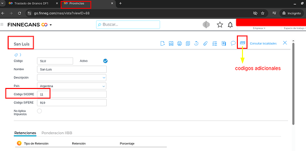 - Agregar el código correspondiente a cada una en la solapa “Códigos adicionales” del maestro de provincias.