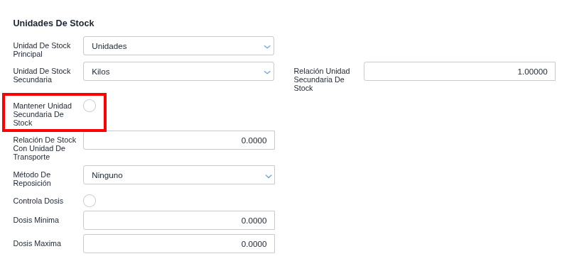 Active el check de la opción: Mantener Unidad Secundaria de Stock