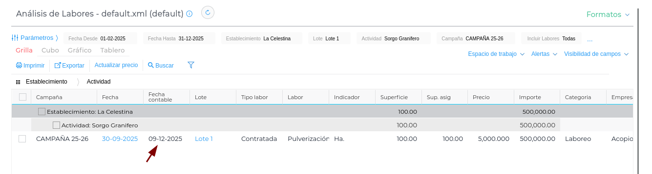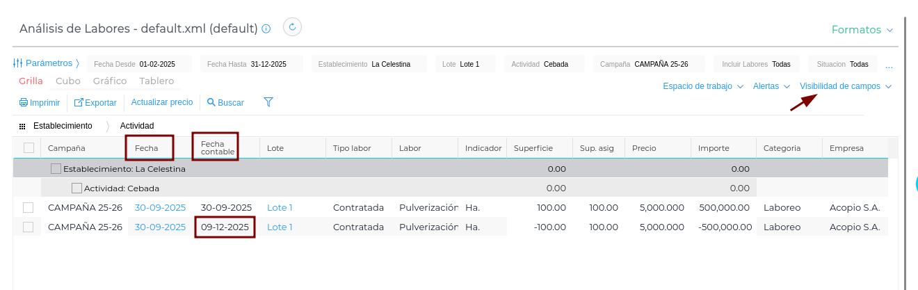 Tomando de ejemplo el informe de Análisis de Labores, desde visibilidad de campos agregamos el campo de fecha contable si no la vemos en dicho informe. En la primer imagen se ven el laboreo original, cuya fecha y fecha contable coinciden, y el laboreo negativo de reasignación, en el cual la fecha contable cambia a la fecha de reasignación: