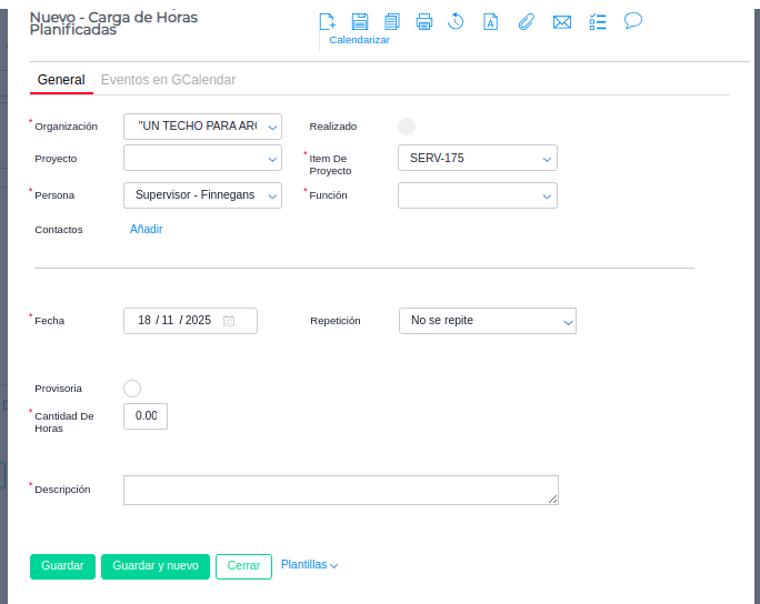 Indicar la cantidad de horas planificadas (*): Indicar el valor de la planificación. Las horas reales del formulario se autocompletarán inicialmente con el valor ingresado como planificado, aunque este campo es editable.