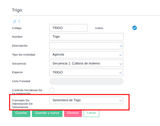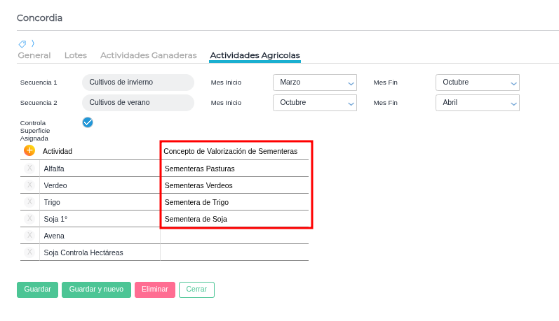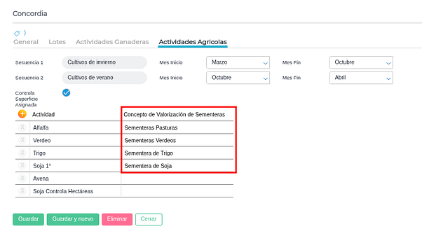 Existen dos posibilidades de asignación, desde el maestro de actividades o desde el maestro de establecimientos. Lo importante es definirlo en cualquiera de estos dos indicando el concepto que tomará el sistema para valorizar las sementeras de los cultivos.
