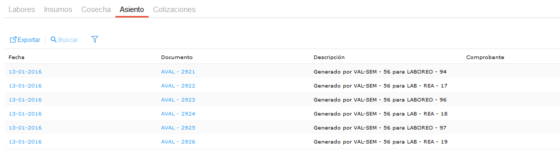 - Asiento: Esta solapa muestra el asiento de sementera generado al presionar generar asientos.