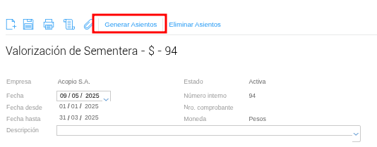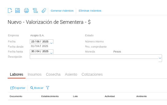 La valorización genera asientos por cada parte de labor procesados en un período. Las cuentas en sí que se utilizarán son las definidas en los conceptos de valorización de sementera de cada actividad. Los centros de costo que se asignan a las cuentas que lo exigen (como una cuenta de sementera, o una cuenta de consumo, por ejemplo) los toman del parte de labor acorde a la actividad-campaña-establecimiento.