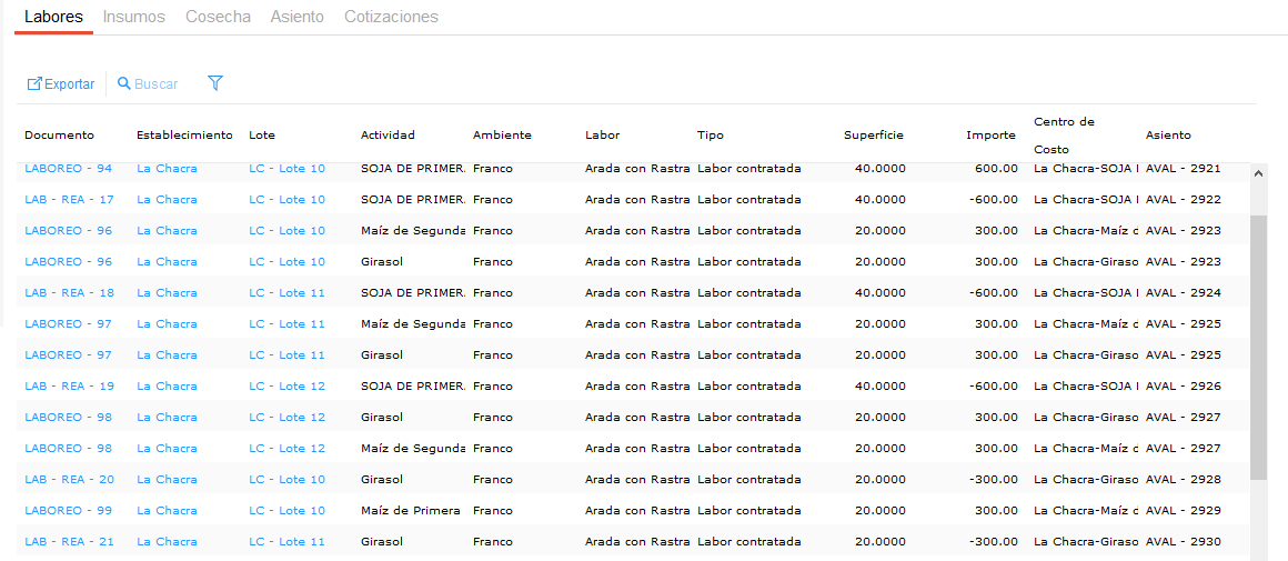 - Importe: El sistema indica el costo de la labor para ese lote.
