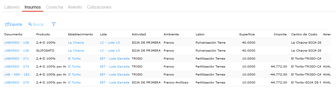 Importe: El sistema indica el costo de los insumos aplicados para ese lote.