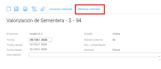 Por lo tanto, en caso que se necesite revalorizar las sementeras, hay que eliminar el documento mediante el botón de eliminar.