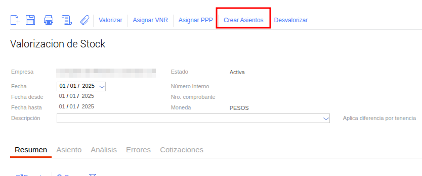 - Una vez finalizado el proceso de valorización, comenzar la generación de asientos.