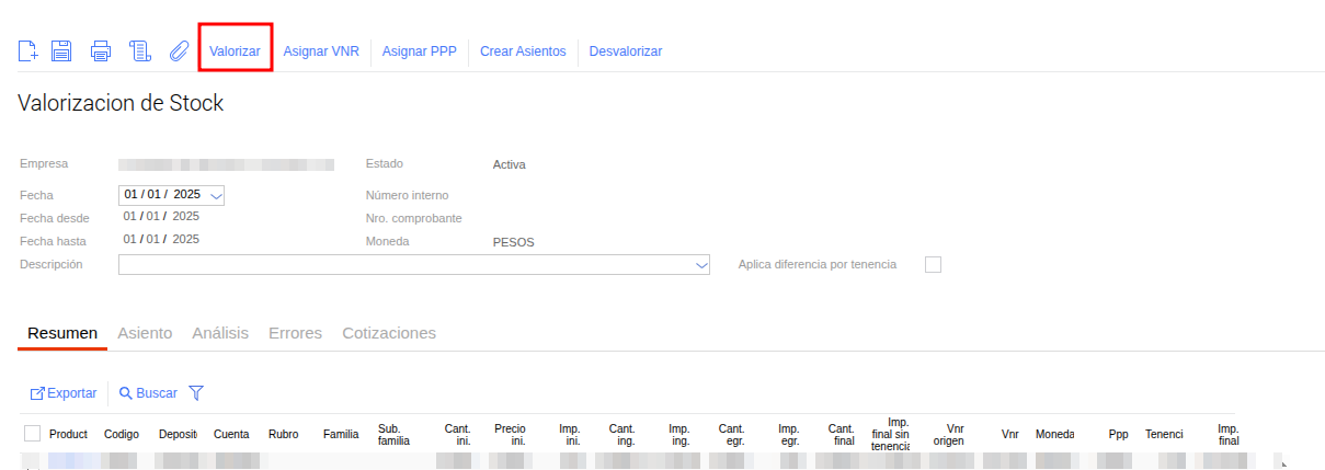 - Ingresar a valorización de stock: Menú → Gestión Empresarial → Contabilidad → Valorización de Stock.