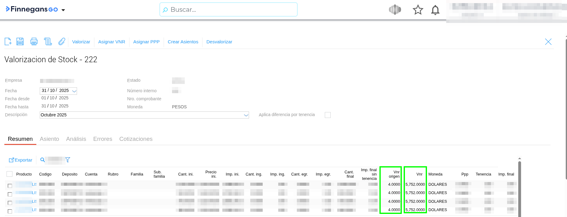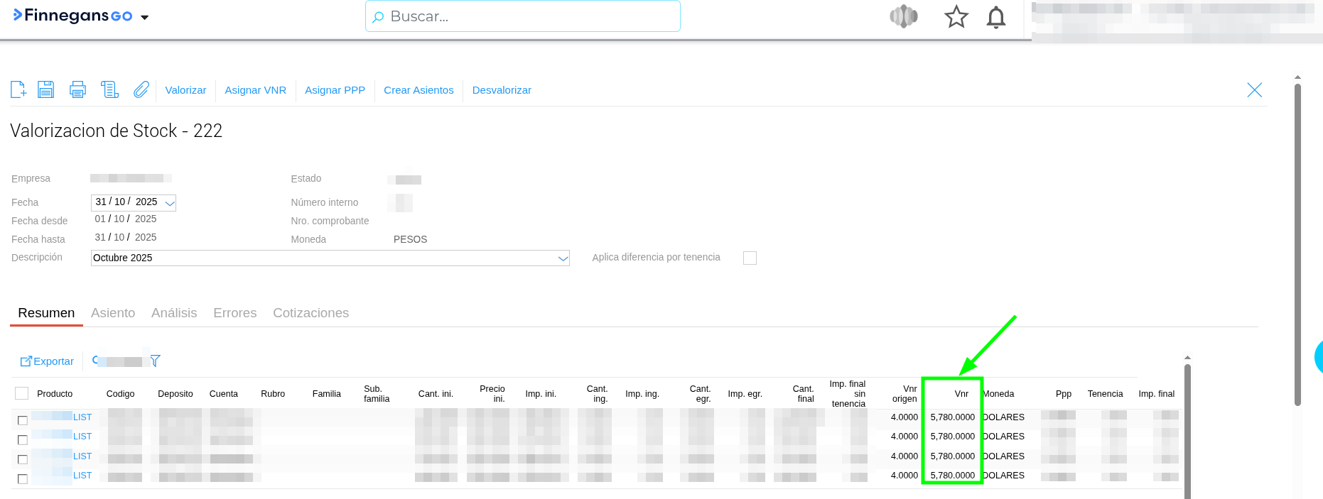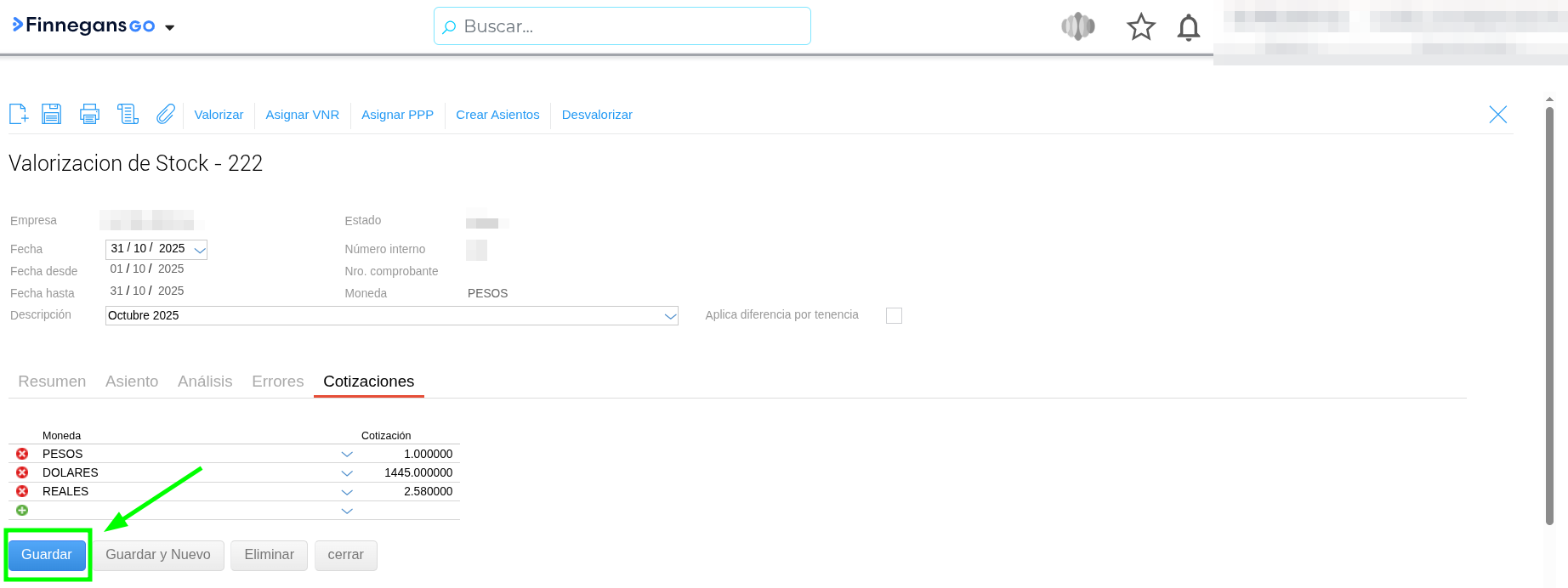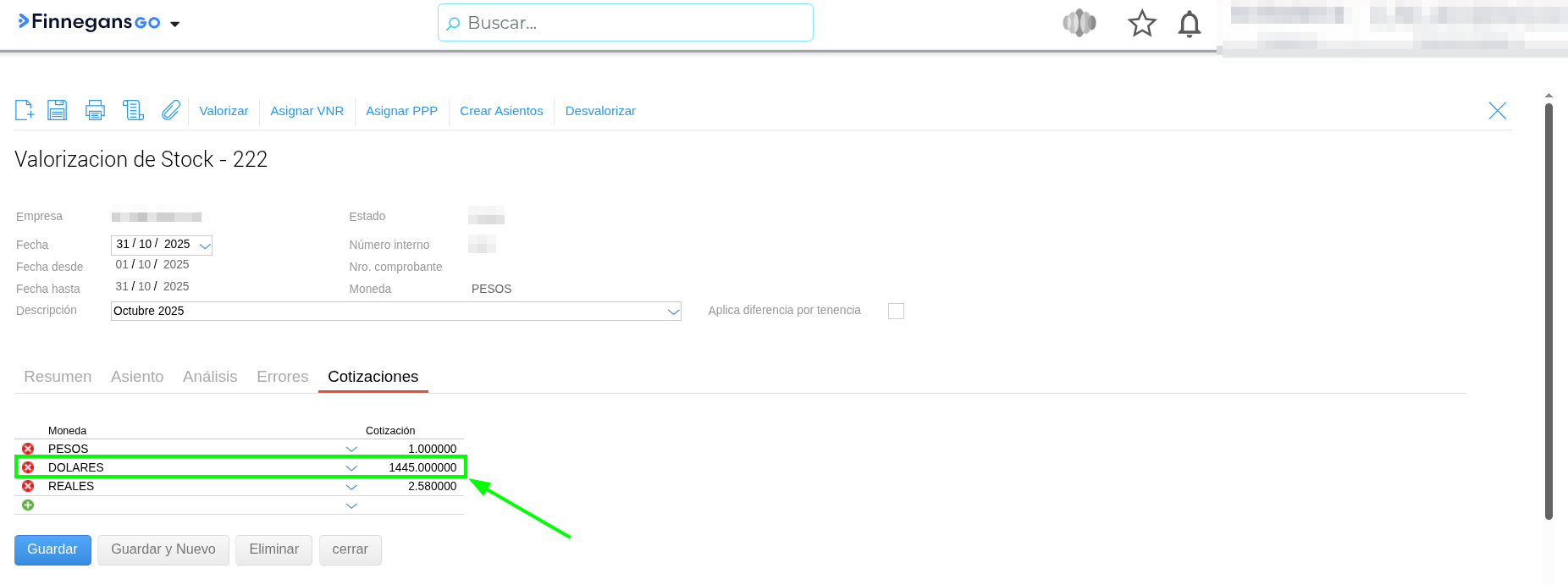 Consulta: Al realizar una Valorización de Stock, si se edita la cotización de una moneda desde la solapa “Cotizaciones” y luego se intenta asignar el VNR (Valor Neto de Realización), el sistema no actualiza automáticamente dicho valor. ¿Por qué sucede esto y cuál es el orden correcto para que tome el cambio?
